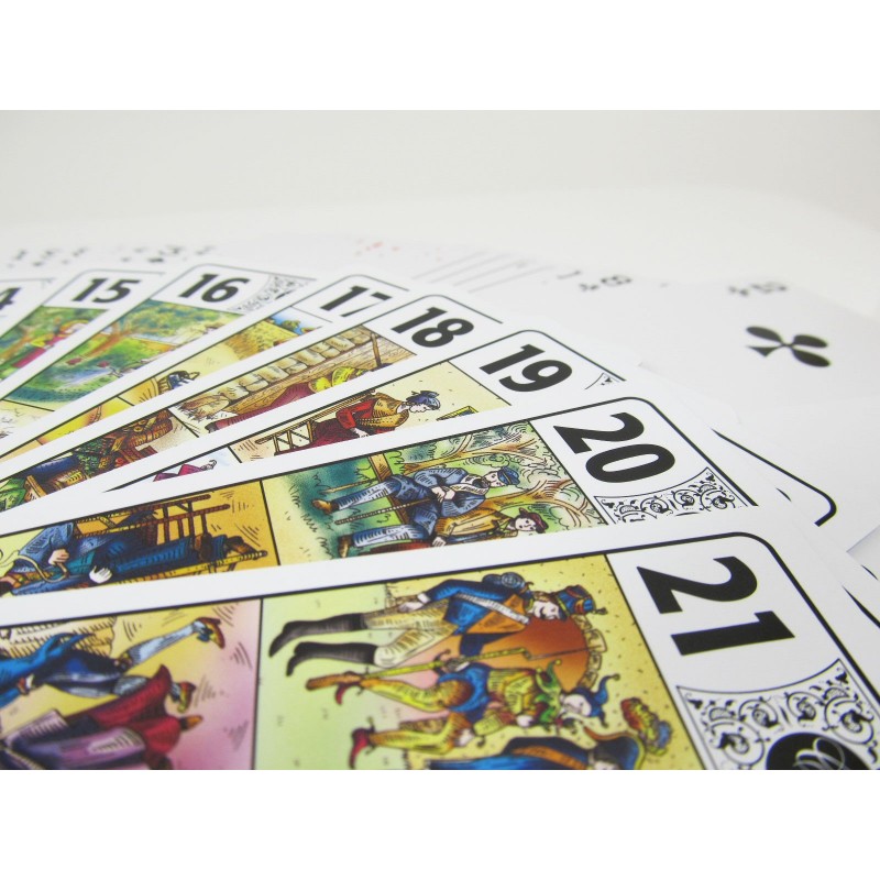 Jeu de tarot 79 cartes dos bleu (78 + 1), bord blanc tournant de 4mm, vernis, faces classiques.