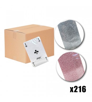 Carton de 18 cartouches de 12 jeux de 55 cartes dos bleu et dos rouge, bord blanc tournant de 4mm, vernis pro, qualité 300g casino, emballage de chaque jeu sous cellophane transparente