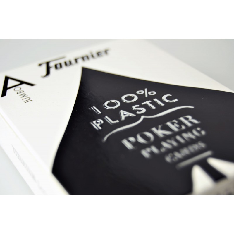 Jeu de 55 cartes 100 % plastiques, dos bleu, bord blanc, index Jumbo marquées aux 2 coins. Emballage sous cellophane transparente + étui carton+ cellophane extérieure.